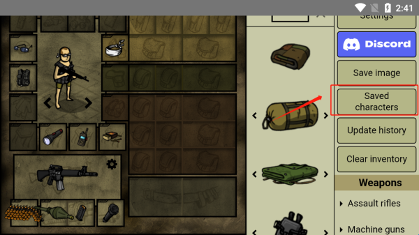 进入游戏首页,游戏开始后可点击右侧一列框中的任意一项(初save.land.clear)每一项为所对应的内容。例:bag为书包和军用背包,eye为夜视仪和战术护目镜。用手拖动至人物四周对应的方框内,如果对应方框错误则无法保留所选物品。注:暗色部分需放置背包等物品解锁贮存空间