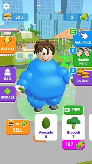 2、进入游戏后,玩家将需要将自己打造一个绝对的吃货,点击屏幕可以让角色进行吃下方的食物,每个食物下方的数字代表吃完获得的金钱;