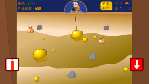 5、操作简单,在钩子摇摆的过程中,瞄准金子,点击屏幕时即会释出钩去抓取金子。