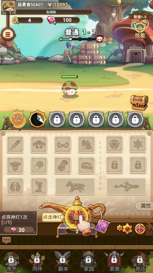 7、点击下方的【角色】,点击技能,可以对蘑菇进行一键装配或者一键强化。