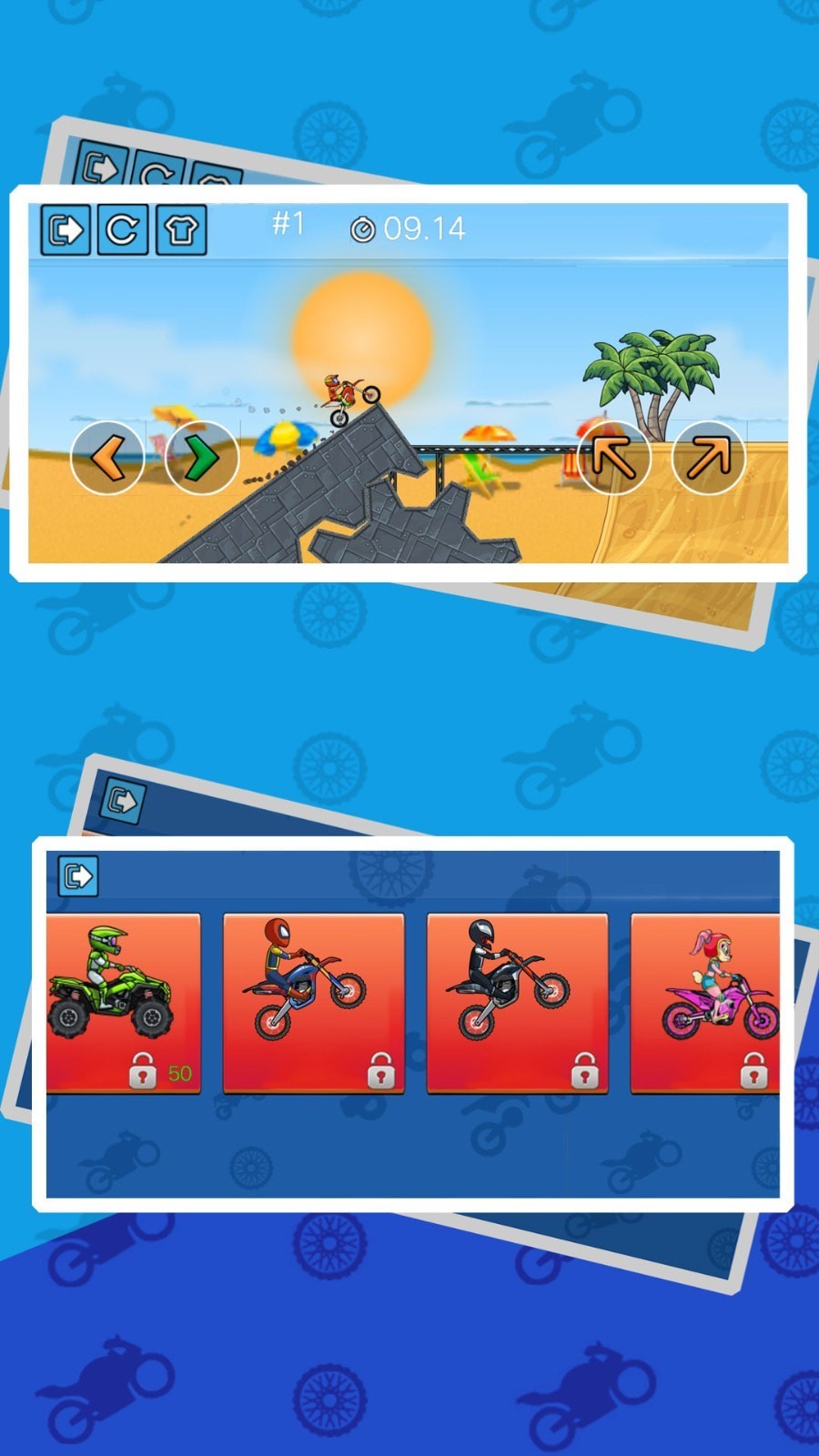 3、在丰富多彩的卡通世界中感受激情的摩托车驾驶,解锁更多的摩托车来参与游戏吧。