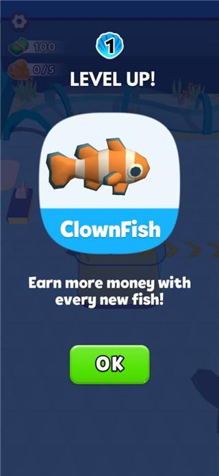3、卡通化的放置玩法非常简单,玩家只需点击同一条鱼就可以创造出新的鱼,让你轻松体验治愈游戏的感觉。