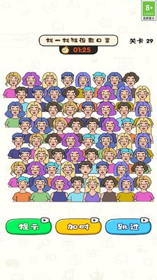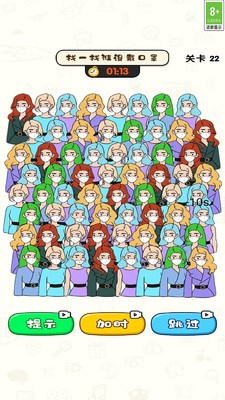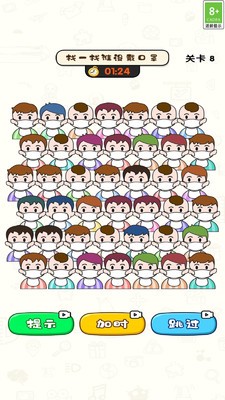 找到消失的她是一款非常有趣的找茬闯关游戏,游戏里面需要在图片里面寻找没有带口罩的角色,非常考验玩家的观察能力,还有海量的游戏关卡等你体验,每个关卡都能给你带来不一样的游戏乐趣,让你可以在这里玩得过瘾,游戏操作简单易上手,喜欢的小伙伴快来下载吧。