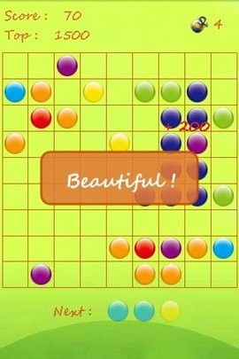 3、当五个同色球组成一条时,就能得分并可以消除这五个球。