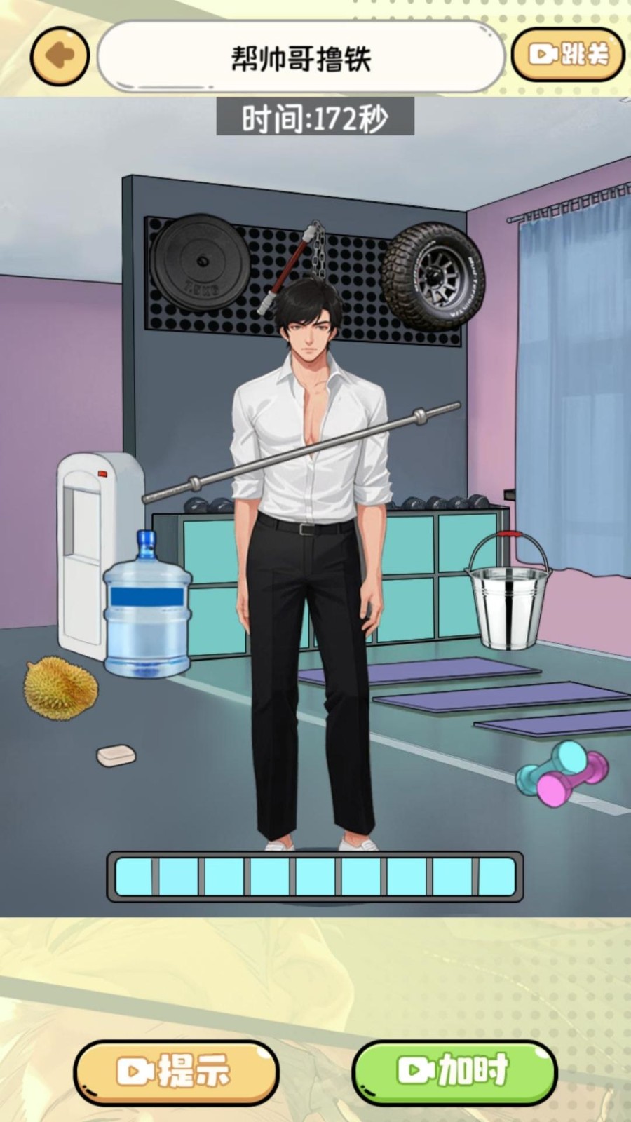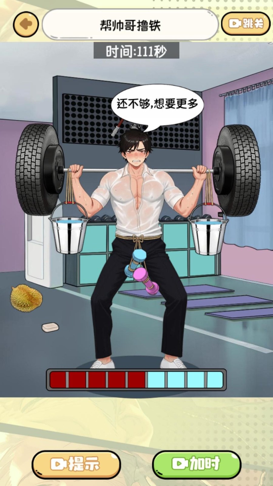 1、你要帮助帅哥撸铁,加大重量,坚持越长的时间,得分越高。