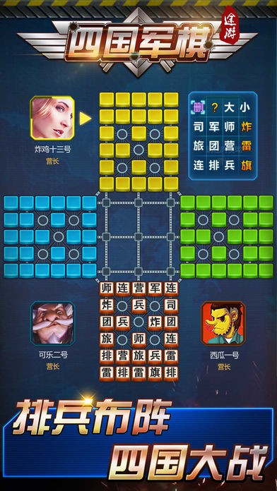 5、当四人游戏时,又叫四国军棋,四人在棋盘上分占四角,分为两方,相对的两家联盟与另外两家对抗,互相配合战斗。
