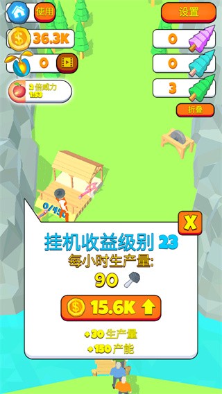 4、游戏中将会为玩家提供多种不同的伐木技巧,玩家可以通过升级提高效率。