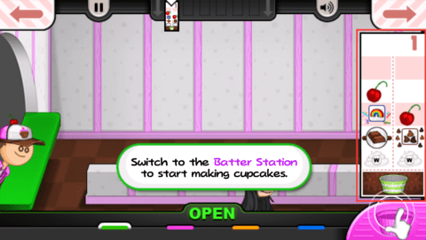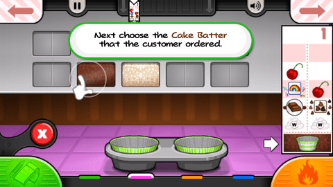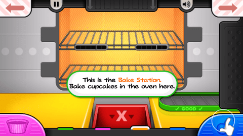 1、玩家将在卡通风格化的蛋糕店之中制作可爱的纸杯蛋糕,根据指引制作甜品,放入烤箱。