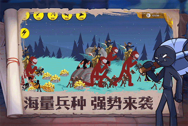 1、该游戏是一款以火柴人为背景的策略战斗游戏。