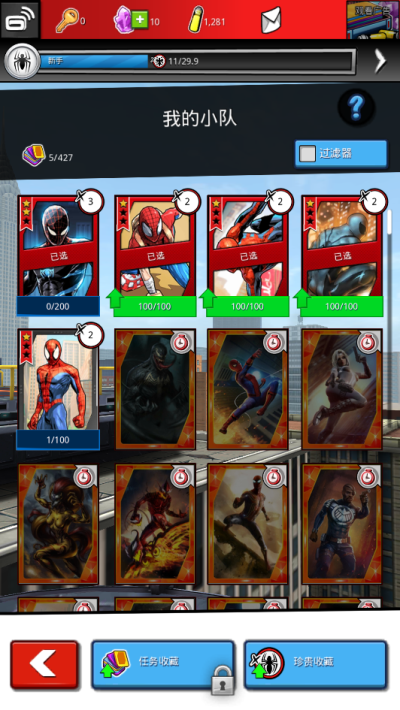 收集、融合并升级蜘蛛侠,每个蜘蛛侠都有其独特的优势,你还可以派他们在曼哈顿执行“蜘蛛侠行动”任务!