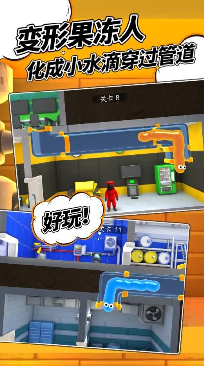 1、游戏将果冻人和小水滴相结合,使得玩家可以在游戏中体验到果冻人独有的形变和弹跳能力;