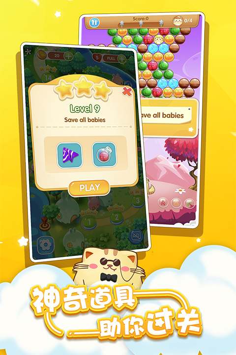 4、开心萌猫泡泡龙的画面非常的梦幻精致,消除特效也超赞,玩起来非常爽快。