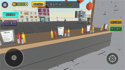 4、此时玩家将会回到自己的店铺之中,厨具已经购买完毕,玩家则需要进行食材的购买,再次来到屏幕的右侧方,点击【购买食材】按钮;