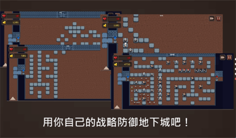 1、你的游戏技巧和战略越强大,阻挡的敌人就越多,设计完美的地下城,阻挡敌人入侵。
