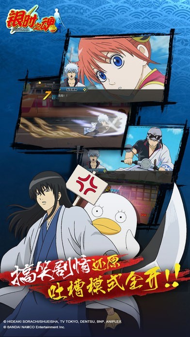 主要角色 坂田银时、志村新八、神乐、定春、桂小太郎、伊丽莎白、土方十四郎、冲田总悟、近藤勋等等《银时之魂》还原银魂中的剧情,继承了其毒舌、搞笑、吐槽、无厘头的恶搞精神,融合游戏世界观--江户时代的武士道。还原原作的剧情内容,配合游戏中多样委托任务、战斗羁绊,呈现最纯正的银魂正版授权手游。