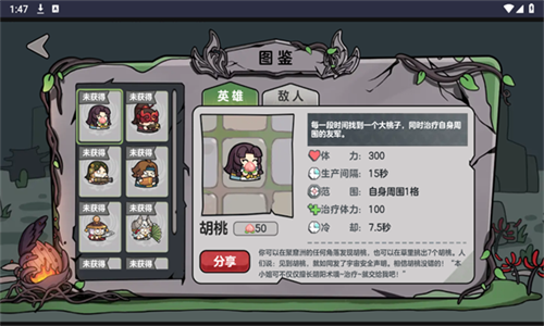 1、游戏玩法与植物大战僵尸类似,通过放置胡桃产出桃子,来购买更多的英雄。