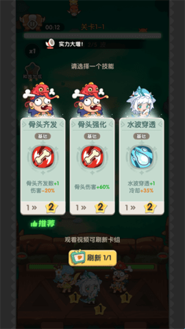 2、游戏里的每一个技能都是随机生成的游戏里还会为玩家们推荐当前可以选择的技能,游戏开始后会送给玩家们的大量的游戏奖励,多达一千张抽奖券等你获取,通过关卡获取大量奖励;