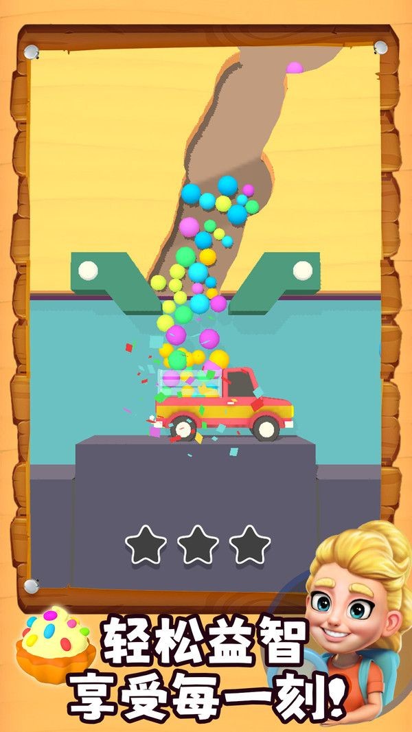 1、努力的挖沙,成功的让小球掉落到卡车上面,就可以进行运输了。
