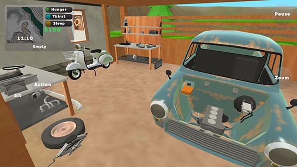 2、我们进入了一个房子里,左边可以控制移动、站坐、行动还有显示地图和状态,右边可以放大缩小视角;