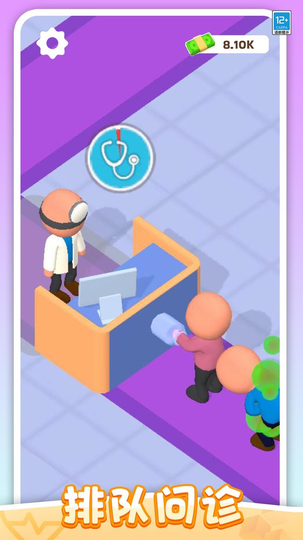游戏玩法简单而有趣,进入游戏时,你将根据指引,帮助来到医院的病人挂号,为他们寻找病床入院,并对他们进行紧急治疗,当治疗时间完成时,病人就可以痊愈,恢复健康的身体状态出院,此时你便可以获得奖励报酬!当你拥有足够的资金时,你可以对你的医院进行扩建,建造更大的空间区域,放置更多的病床,以便容纳更多的病人,同时你还可以对医院病房进行升级改造,将它打造得更加温馨,让病人在这感受到温暖!当你的医院建造得足够完整时,你可以开启你的其他医院,比如整形医院.皮肤医院等,开展全方面的业务,为更多的病人提供服务,让他们获得一个健康的身体!
