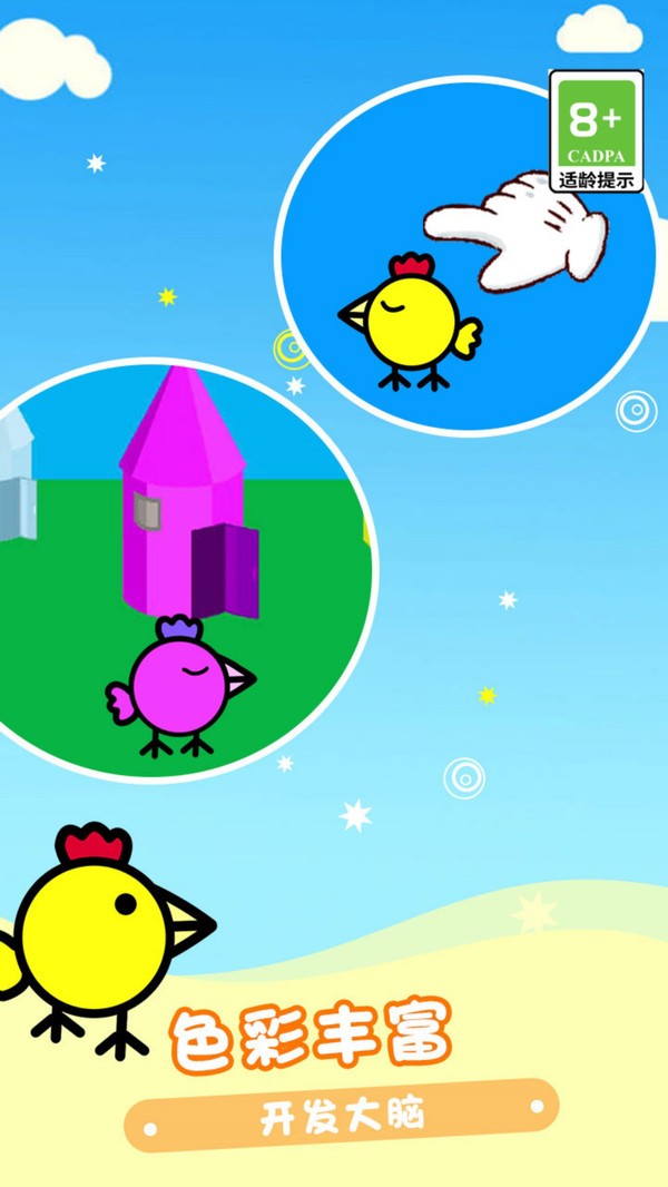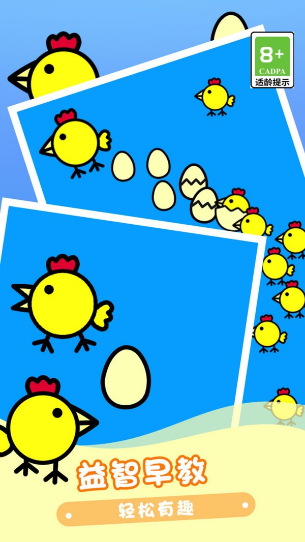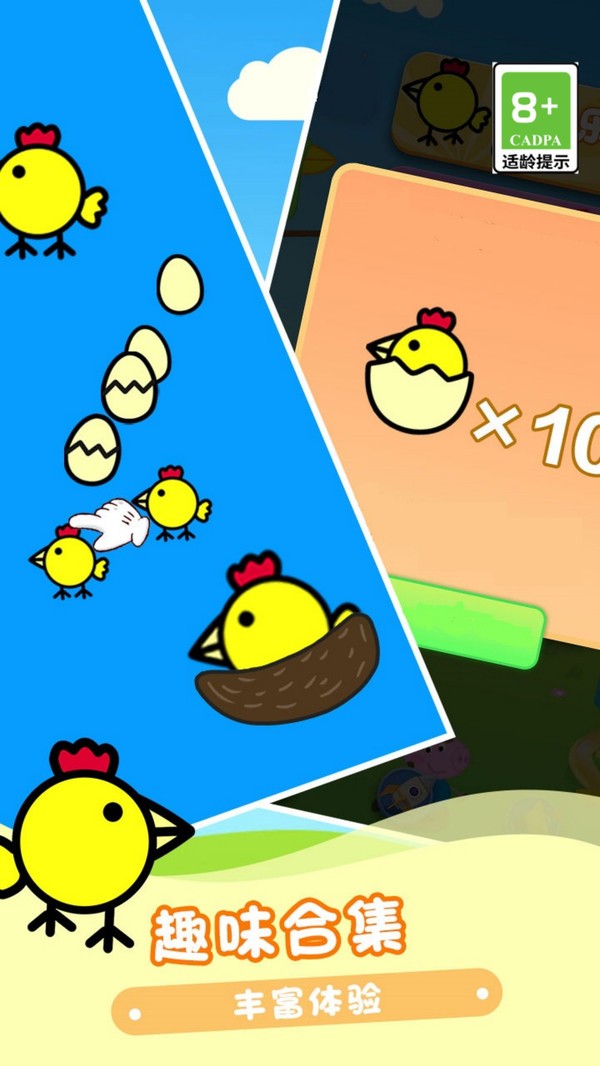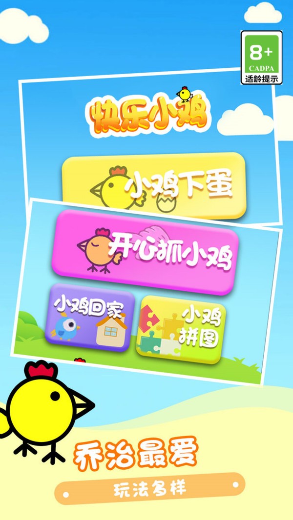 快乐小鸡手机版是一款免费的休闲小游戏,通过喂食小鸡长大然后母鸡下蛋生小鸡,简单的自然过程让孩子在游戏中增长见识