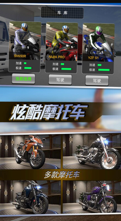 1、驾驶拟真的摩托车,在规定的道路上挑战用更短的时间达到终点。