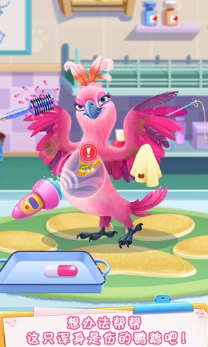 3、接下来是帮助翅膀受伤的鹦鹉小姐,先用毛巾给鹦鹉小姐清理身上的污渍,然后用针线帮助她把断掉的羽毛修复好,最后用梳子帮她梳理羽毛就可以了。