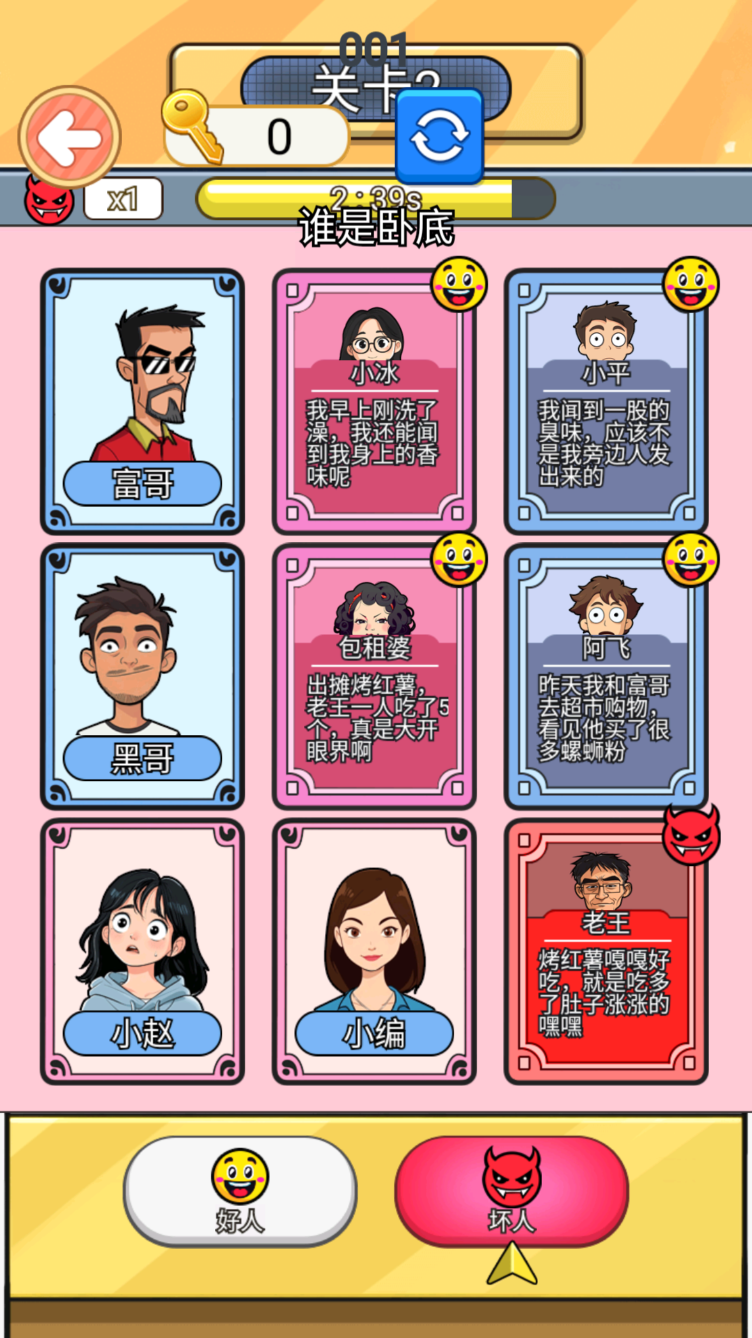 1、需要与不同的人物互动,了解他们的动机,从而找出隐藏在其中的卧底。
