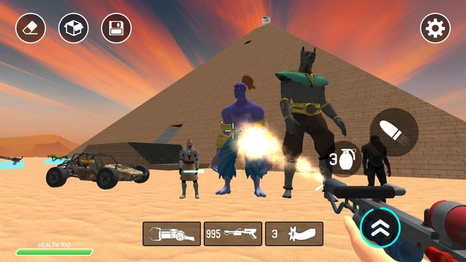 1、控制角色在沙漠场景中移动、转向,灵活躲避机器人的攻击。