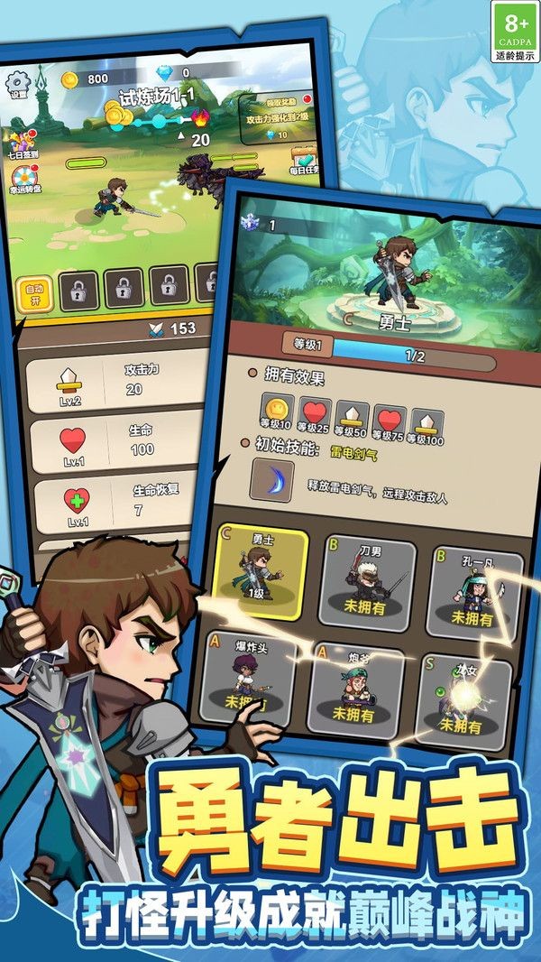 1、升级勇士的攻击力和生命值,增强自身战斗能力,轻松地应对敌人。