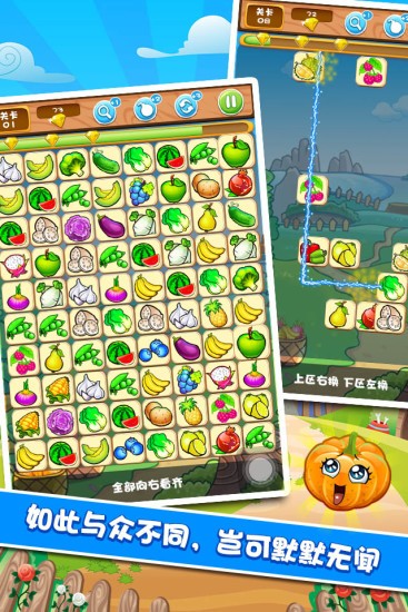 果蔬连连看3拥有丰富多样的关卡设计,线上操作十分便利,每一关都有不同的布局和难度,玩家可以自由选择不同的关卡内容进行挑战,还可以邀请你的好友一起来互动玩耍,与朋友一起比拼分数,游戏适合不同年龄段的玩家来尝试,通过丰富的道具系统可以为你轻松闯过不同的关卡,没有网络的情况下也不会影响你的游戏体验,而且后期关卡内容还在不断更新,详细的新手攻略和活动内容也都为玩家们提供了,在增加竞争难度的同时,也为玩家们带来了更加新鲜有趣的游戏体验。