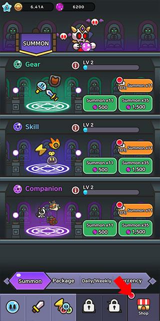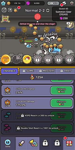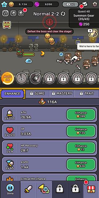 2、消耗金币以升级技能、强化角色装备,让史莱姆更加强大。