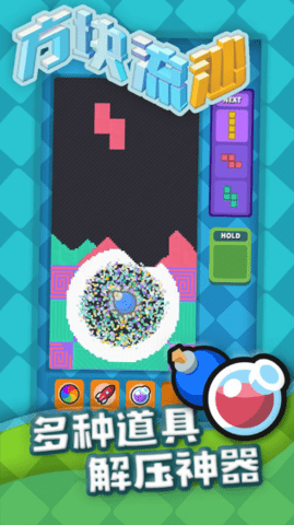 1、像素风格的消除闯关类游戏,拼合不同形状的方块成线,流沙般的消除;