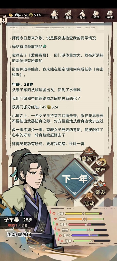 江湖人生是一款模拟江湖人生的游戏,玩家开局出生选择天赋,然后带着天赋慢慢成长到17岁,选择门派开启江湖人生,在江湖人生中,不仅有江湖争斗还有商战,玩家将在这里体验到江湖人的一生。
