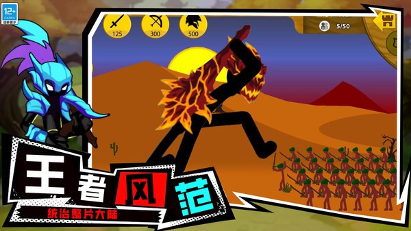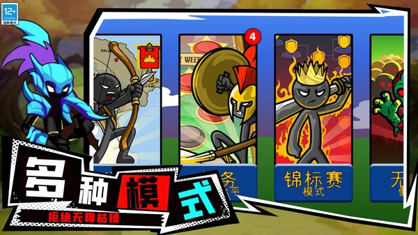 2、包含多种火柴人角色,如矛兵、矿工、剑士、巨人、弓箭手和僵尸坦克等。