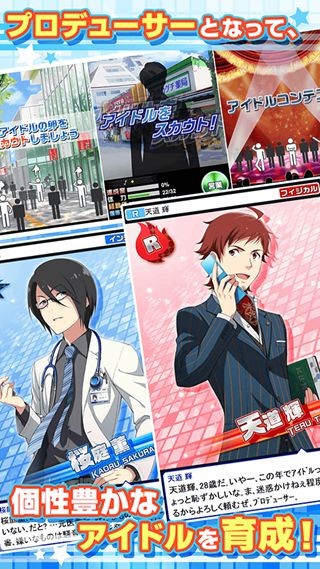 一款由玩家扮演经纪人来培育偶像,以《偶像大师》的概念为主轴的偶像培育卡片游戏。偶像大师sidem安卓版中将有各种经历跟丰富个性的男性偶像们陆续登场。玩家要以经纪人的身分去挖掘陆续登场的医生、打工族、自卫官等社会人士跟学生来组成自己喜欢的偶像团体。