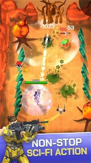1、通过虚拟摇杆进行角色移动,自动攻击射击敌人;