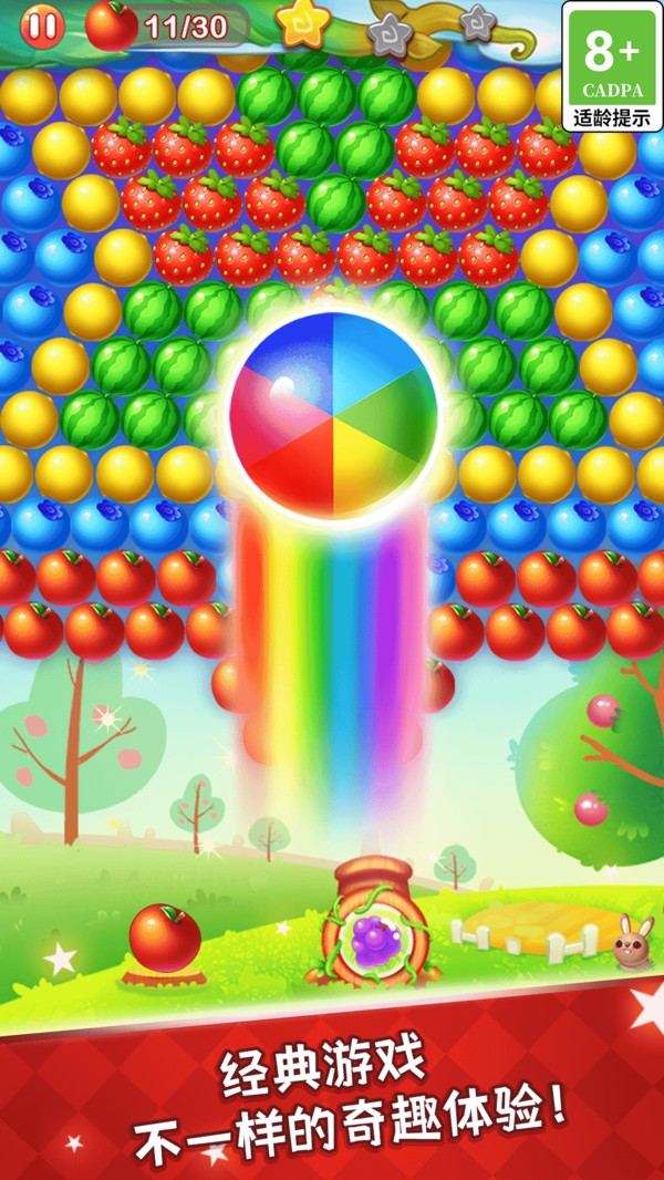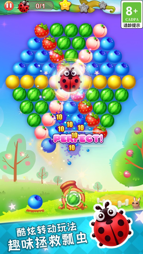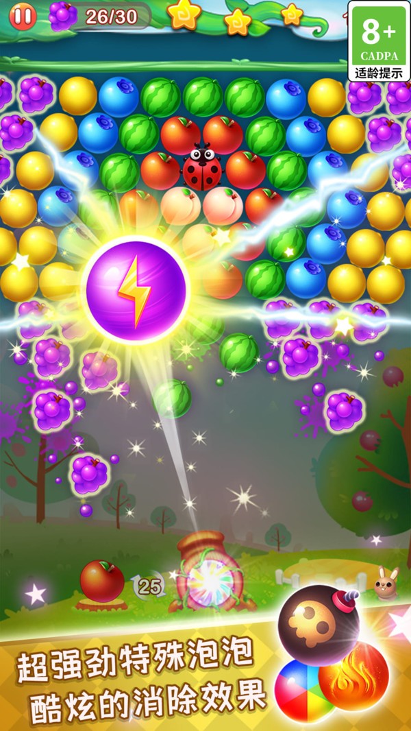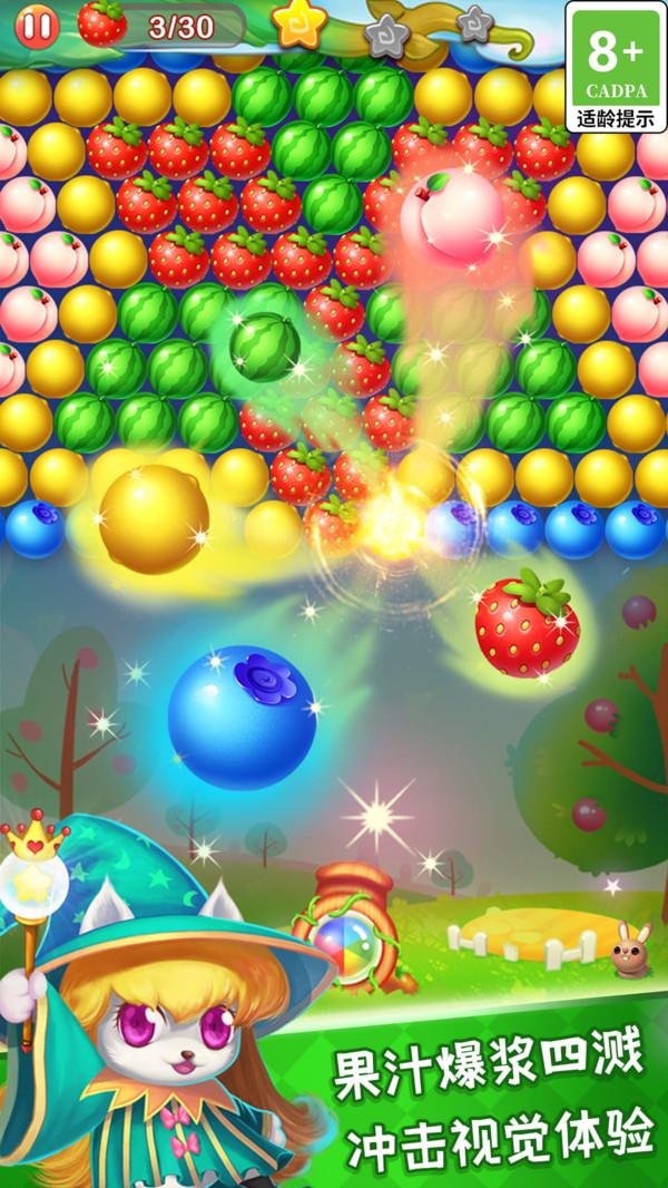 1、高清画质:精美细腻的游戏画面,色彩缤纷的水果泡泡,带来视觉盛宴。
