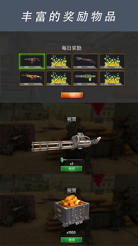 1.逼真的枪支音效以及操作手感设计,从多方面增强自身实力完成挑战模式收获到丰厚奖励,以此体验全新玩法。
