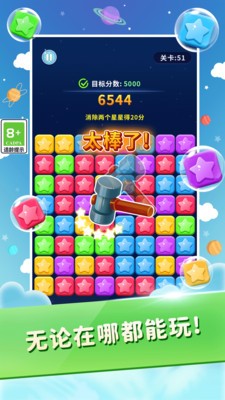 3、离线模式:无需网络连接,玩家可以随时随地享受消除星星的乐趣。