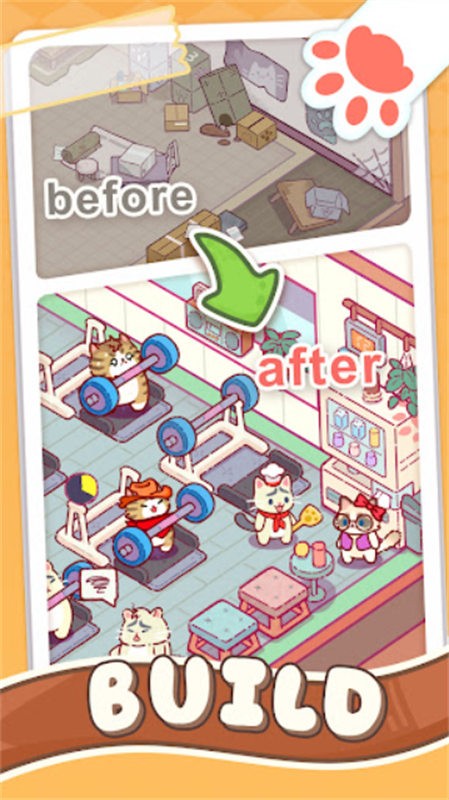 3、互动与社交:你可以与其他玩家互动,分享健身心得,还可以邀请好友一起经营健身房,共同打造猫咪们的健身乐园。