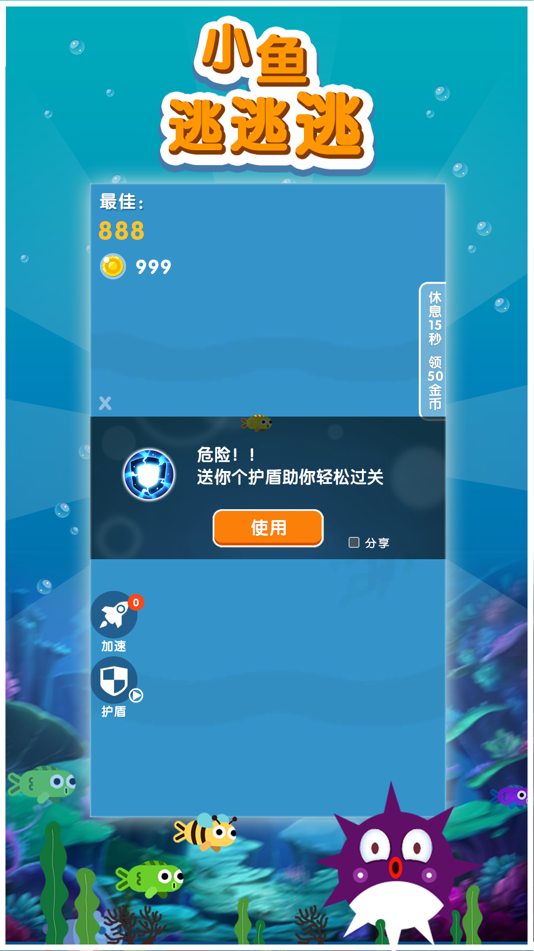 你游着游着,突然发现,前方好多的大鱼,你根本过不去,一过去自己的队伍的小鱼肯定要被吃掉,你可以用左侧的道具—(护盾等)帮助我们躲过大鱼的攻击。
