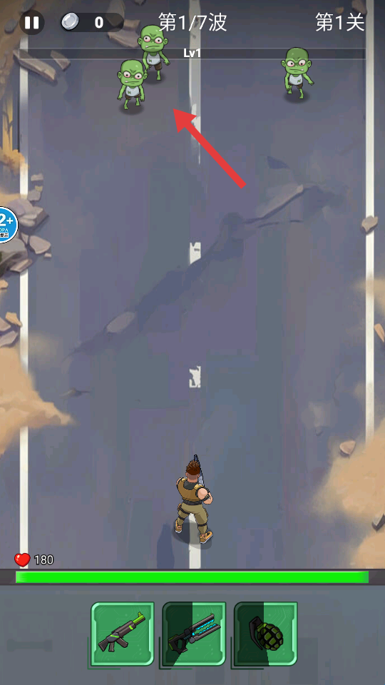 3.进入战斗,面对【Lv1僵尸】,切换装备栏武器,利用范围攻击快速清怪,注意保持生命值。