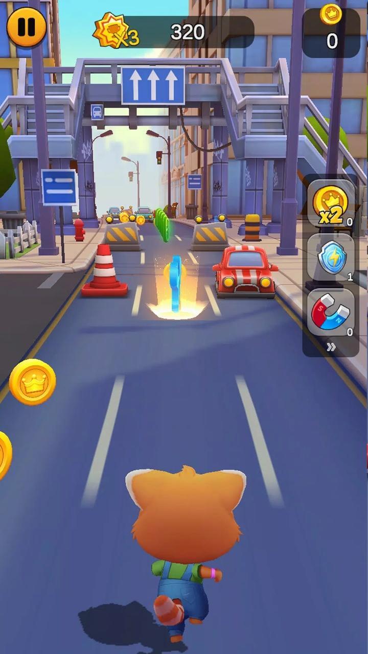 1、玩家通过简单滑动手势控制宠物猫进行跳跃、闪避障碍物等动作,如向上滑动跳过障碍,向下滑动躲避,左右滑动借助建筑等。