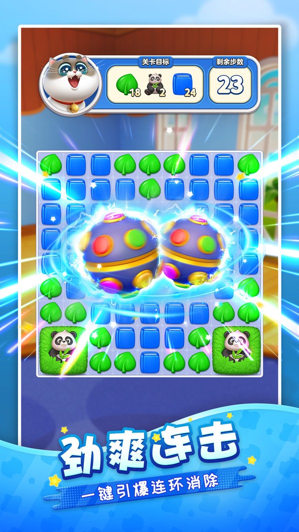 3、【民宿“猫老板”,呆萌可爱随时陪伴】《假日乐消消》头牌心灵理疗师是一只名叫毛毛的猫咪,无论闯关还是建造,它都陪伴左右——欢呼鼓励、傲娇卖萌,又或是调皮捣蛋。轻触屏幕,即可与它亲密互动。(放心,不会掉毛!
