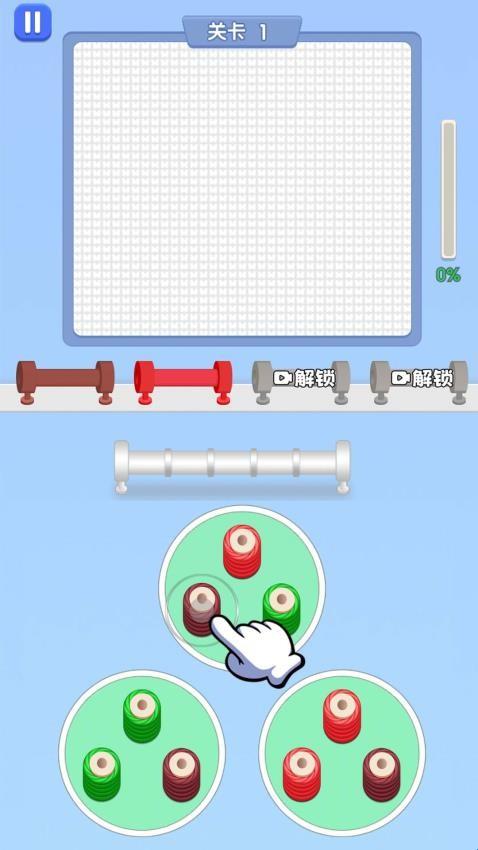 1、进入游戏后,会看到一个五颜六色的毛线圈板,仔细观察并选择相同颜色的毛线圈。只需点击三个或以上相同颜色的毛线圈,即可消除们。