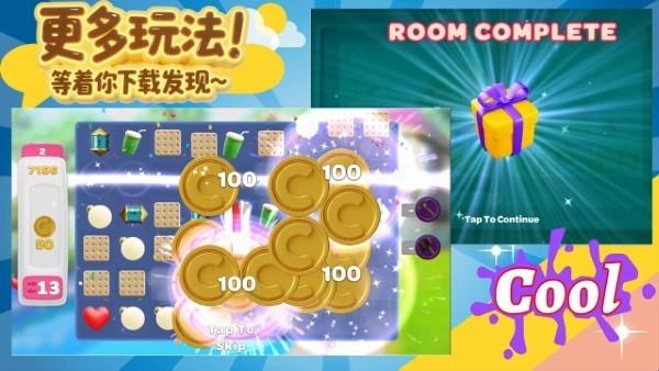 3、核心机制简单,但需要思考和规划。匹配相同颜色的糖果以收集宝贵的资源,这些资源将用于解锁新的家具和装饰物品,每个关卡都提供了全新的挑战。