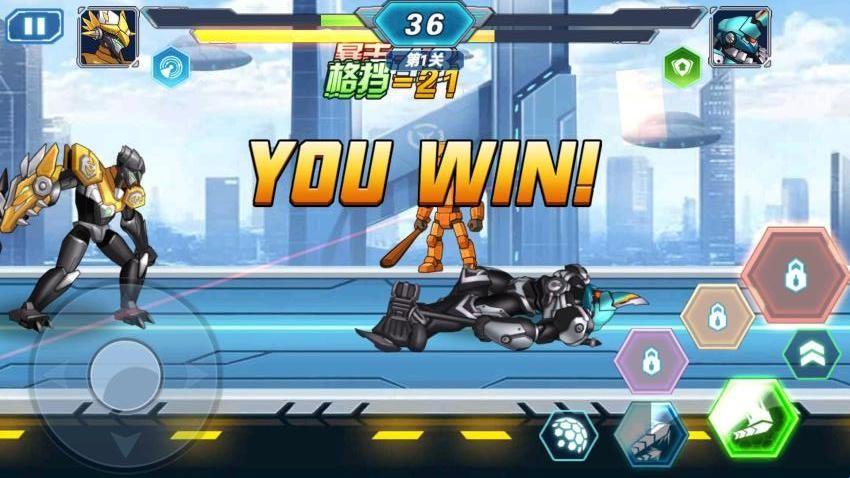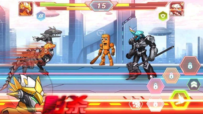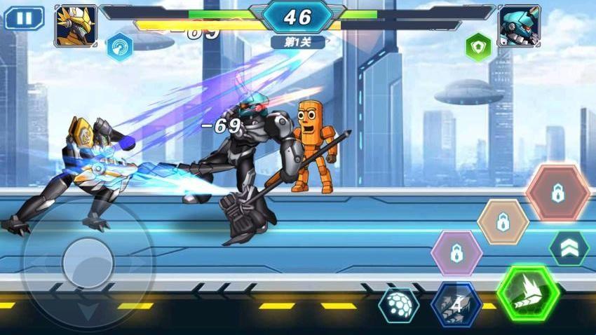 1、通过虚拟摇杆操控机甲走位,躲避敌人攻击,寻找合适时机释放技能,打击对手。