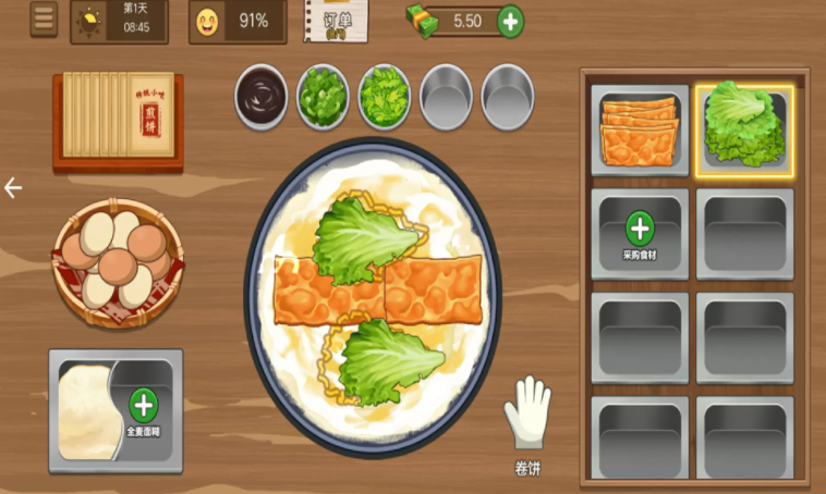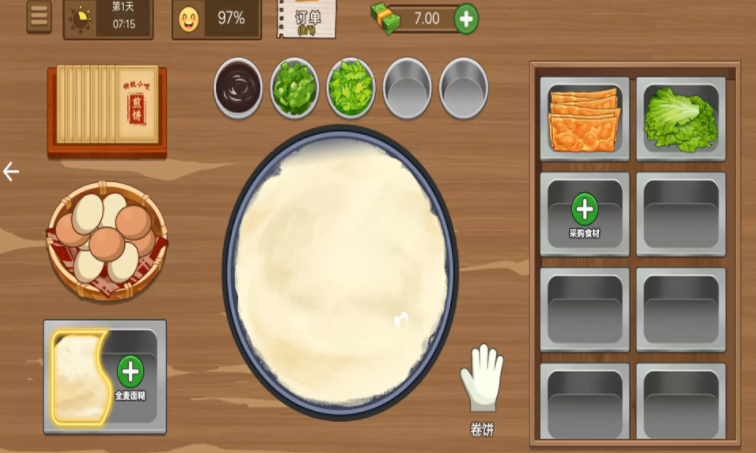 3、玩家化身成为摊煎饼的厨师,用铲勺锅具烹饪美食让客人品尝。
