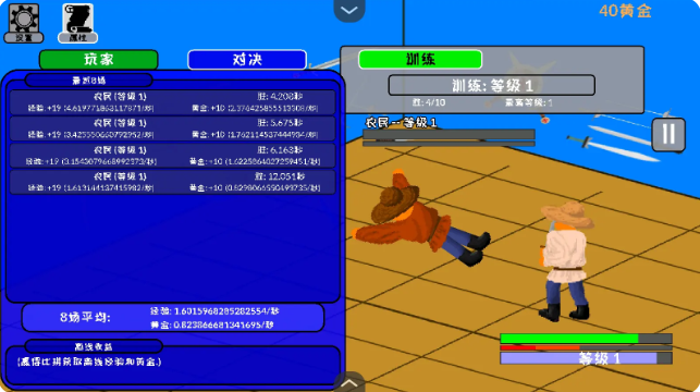 剑斗士放置游戏整体为像素风格,玩家们在这里作为一名剑斗士需要不断的过五关斩六将,根据游戏文字引导,寻找对手,制定完美的作战部署,巧妙的利用连招将其击败,提升个人战力值,让自己更加强大,成为第一剑斗士即可!